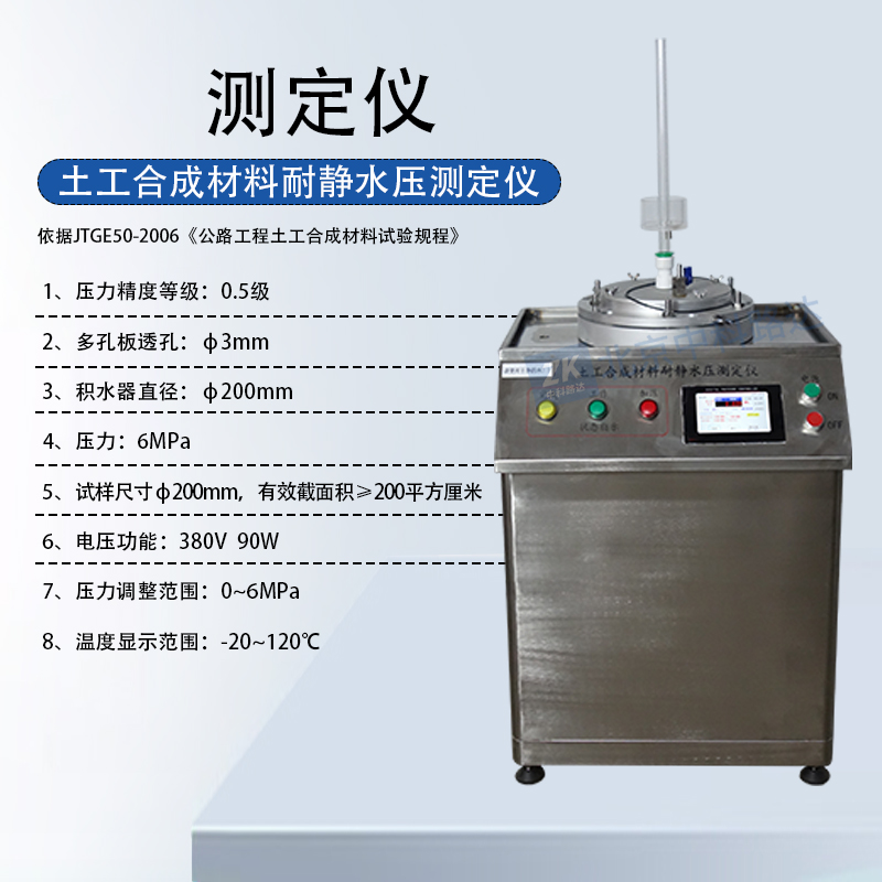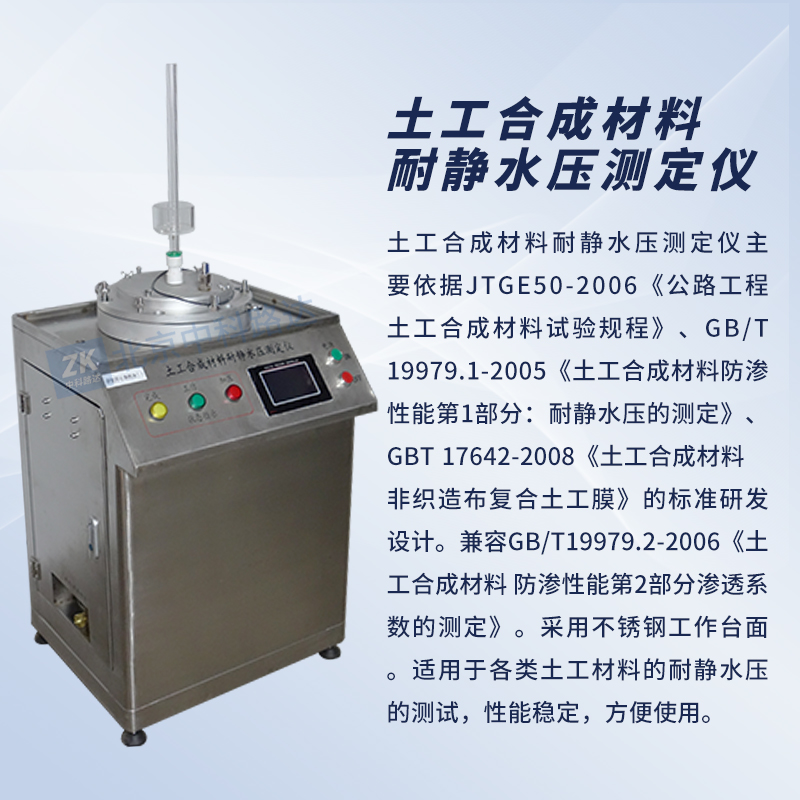 土工合成材料耐靜水壓測定儀主要依據JTGE50-2006《公路工程土工合成材料試驗規程》、GB/T 19979.1-2005《土工合成材料防滲性能第1部分:耐靜水壓的測定》、GBT 17642-2008《土工合成材料 非織造布復合土工膜》的標準研發設計。兼容GB/T 19979.2-2006《土工合成材料 防滲性能第2部分滲透系數的測定》。采用不銹鋼工作臺面。適用于各類土工材料的耐靜水壓的測試,性能穩定,方便使用。