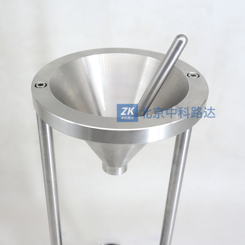 2、用塞棒塞住漏斗流出口。將塵樣裝入盛樣量筒,用刮片刮平后倒入漏斗中。
