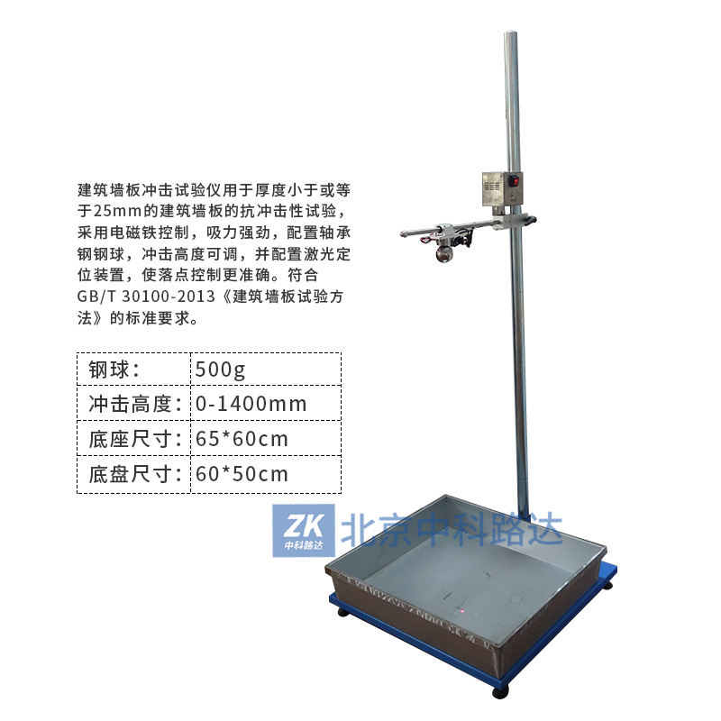 建筑墻板沖擊試驗儀用于厚度小于或等于25mm的建筑墻板的抗沖擊性試驗,采用電磁鐵控制,吸力強勁,配置軸承鋼鋼球,沖擊高度可調,并配置激光定位裝置,使落點控制更準確。符合GB/T 30100-2013《建筑墻板試驗方法》的標準要求。...