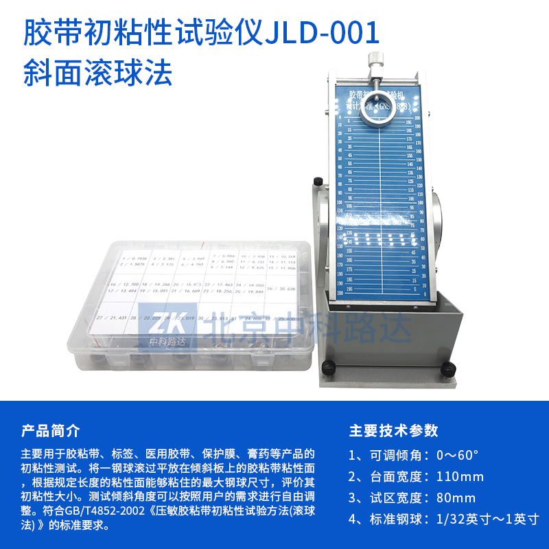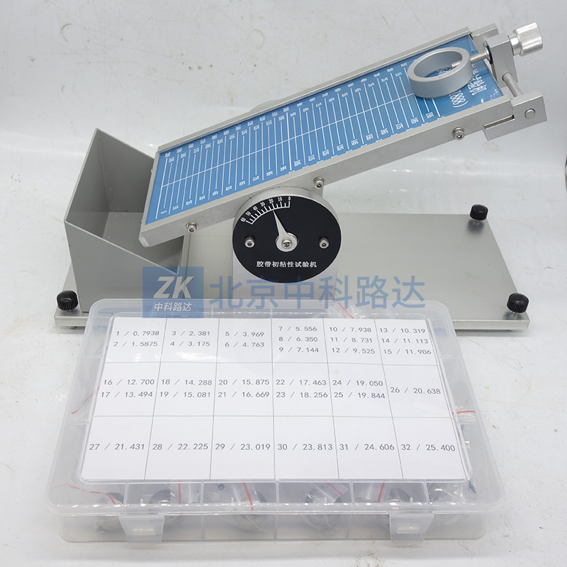 主要用于膠粘帶、標(biāo)簽、醫(yī)用膠帶、保護(hù)膜、膏藥等產(chǎn)品的初粘性測試。將一鋼球滾過平放在傾斜板上的膠粘帶粘性面,根據(jù)規(guī)定長度的粘性面能夠粘住的最大鋼球尺寸,評(píng)價(jià)其初粘性大小。測試傾斜角度可以按照用戶的需求進(jìn)行自由調(diào)整。符合GB/T4852-2002《壓敏膠粘帶初粘性試驗(yàn)方法(滾球法) 》的標(biāo)準(zhǔn)要求。