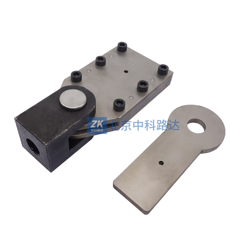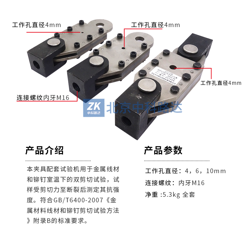 本夾具配套試驗機用于金屬線材和鉚釘室溫下的雙剪切試驗,試樣受剪切力至斷裂后測定其抗強度。符合GB/T6400-2007《金屬材料線材和鉚釘剪切試驗方法》附錄B的標準要求。