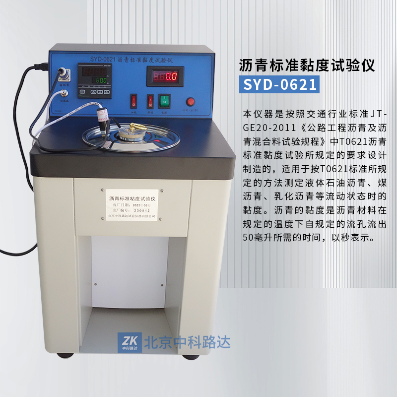 本儀器是按照交通行業標準JTGE20-2011《公路工程瀝青及瀝青混合料試驗規程》中T0621瀝青標準黏度試驗所規定的要求設計制造的,適用于按T0621標準所規定的方法測定液體石油瀝青、煤瀝青、乳化瀝青等流動狀態時的黏度。瀝青的黏度是瀝青材料在規定的溫度下自規定的流孔流出50毫升所需的時間,以秒表示。