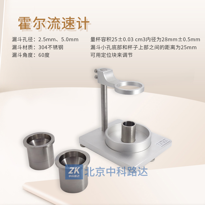 在標準條件下用漏斗測量金屬粉末的松裝密度及流動性,符合GB/T 1479.1-2011《金屬粉末 松裝密度的測定 第1部分 漏斗法》和GB/T 1482-2010《金屬粉末 流動性的測定 標準漏斗法(霍爾流速計)》的標準要求。