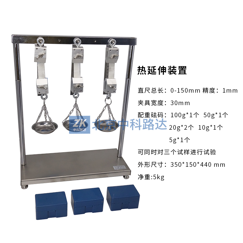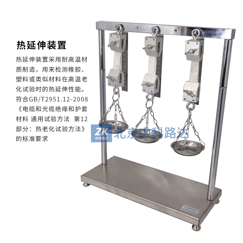 熱延伸裝置采用耐高溫材質(zhì)制造,用來檢測(cè)橡膠、塑料或類似材料在高溫老化試驗(yàn)時(shí)的熱延伸性能。符合GB/T2951.12-2008《電纜和光纜絕緣和護(hù)套材料 通用試驗(yàn)方法 第12部分:熱老化試驗(yàn)方法》的標(biāo)準(zhǔn)要求。采用鋁合金波紋夾具,夾持方便牢固;不銹鋼直尺,刻度清晰;多種配重砝碼,自由組合。