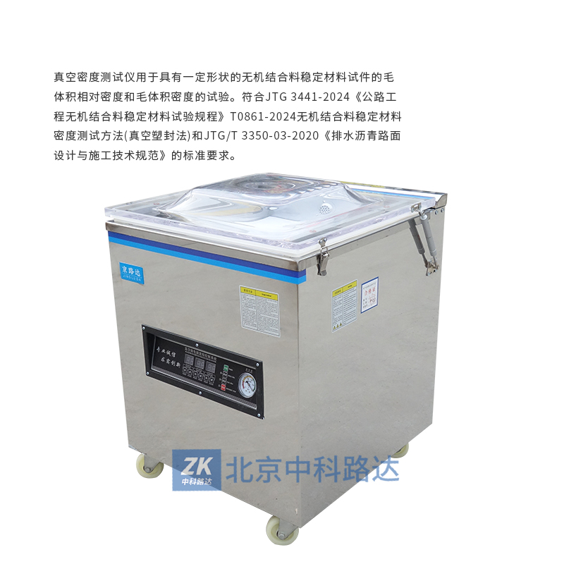 真空密度測(cè)試儀用于具有一定形狀的無(wú)機(jī)結(jié)合料穩(wěn)定材料試件的毛體積相對(duì)密度和毛體積密度的試驗(yàn)。符合JTG 3441-2024《公路工程無(wú)機(jī)結(jié)合料穩(wěn)定材料試驗(yàn)規(guī)程》T0861-2024無(wú)機(jī)結(jié)合料穩(wěn)定材料密度測(cè)試方法(真空塑封法)和JTG/T 3350-03-2020《排水瀝青路面設(shè)計(jì)與施工技術(shù)規(guī)范》的標(biāo)準(zhǔn)要求。