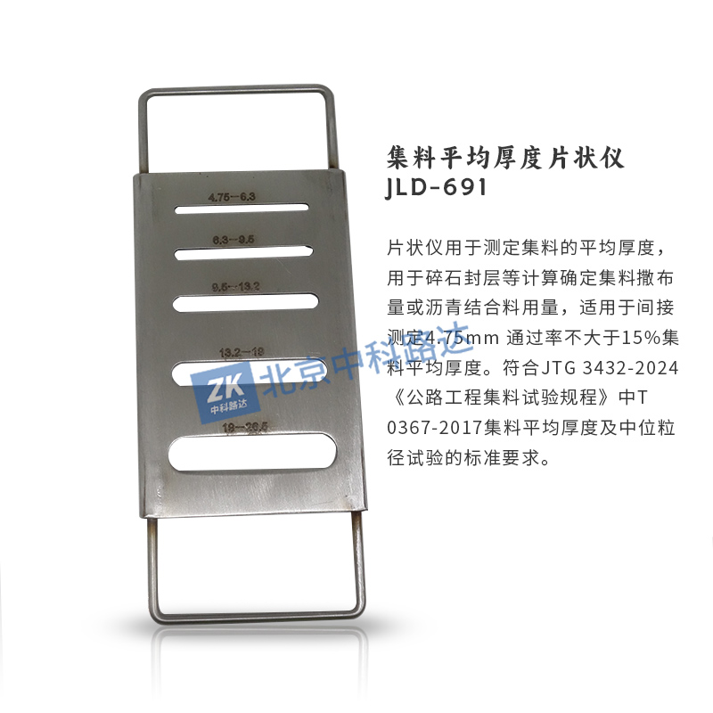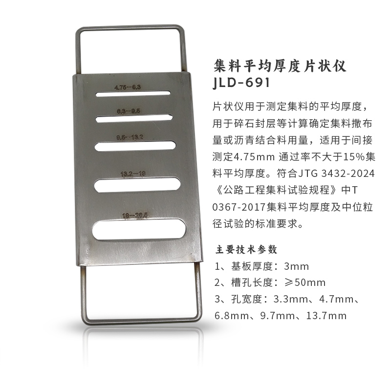 片狀儀用于測定集料的平均厚度,用于碎石封層等計算確定集料撒布量或瀝青結合料用量,適用于間接測定4.75mm 通過率不大于15%集料平均厚度。符合JTG 3432-2024《公路工程集料試驗規程》中T 0367-2017集料平均厚度及中位粒徑試驗的標準要求。