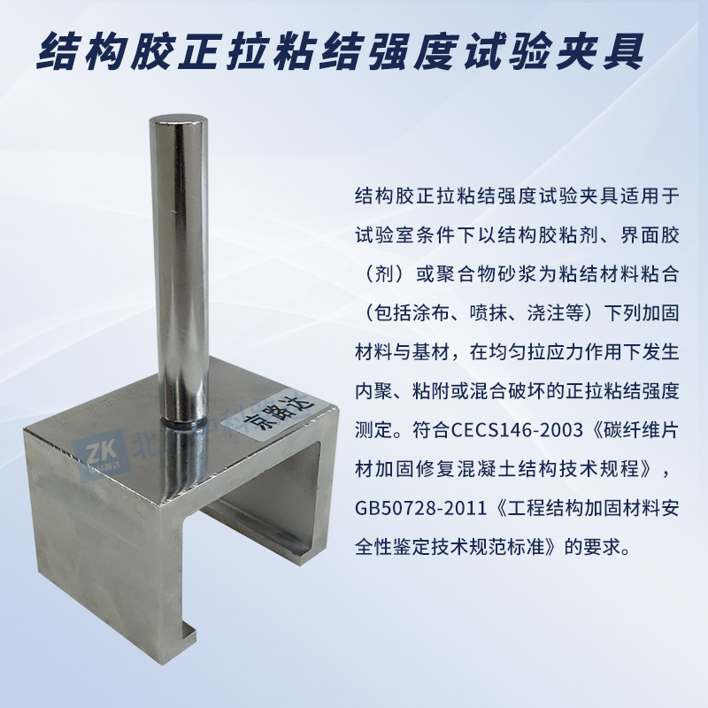 結(jié)構(gòu)膠正拉粘結(jié)強(qiáng)度試驗(yàn)夾具適用于試驗(yàn)室條件下以結(jié)構(gòu)膠粘劑、界面膠(劑)或聚合物砂漿為粘結(jié)材料粘合(包括涂布、噴抹、澆注等)下列加固材料與基材,在均勻拉應(yīng)力作用下發(fā)生內(nèi)聚、粘附或混合破壞的正拉粘結(jié)強(qiáng)度測(cè)定。符合CECS146-2003《碳纖維片材加固修復(fù)混凝土結(jié)構(gòu)技術(shù)規(guī)程》,GB50728-2011《工程結(jié)構(gòu)加固材料安全性鑒定技術(shù)規(guī)范標(biāo)準(zhǔn)》的要求。