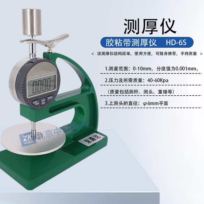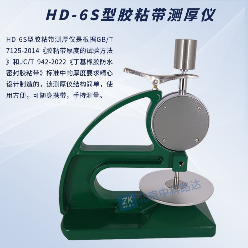 HD-6S型膠粘帶測厚儀是根據GB/T 7125-2014《膠粘帶厚度的試驗方法》和JC/T 942-2022《丁基橡膠防水密封膠粘帶》標準中的厚度要求精心設計制造的,該測厚儀結構簡單,使用方便,可隨身攜帶,手持測量。
