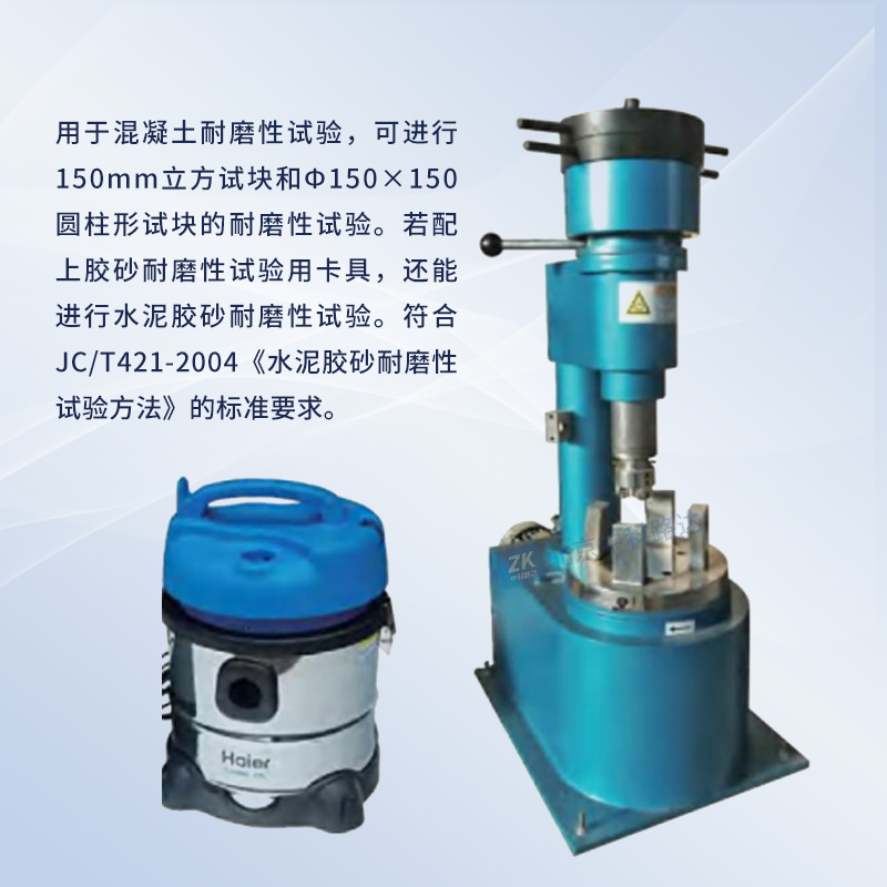 用于混凝土耐磨性試驗(yàn),可進(jìn)行150mm立方試塊和Ф150×150圓柱形試塊的耐磨性試驗(yàn)。若配上膠砂耐磨性試驗(yàn)用卡具,還能進(jìn)行水泥膠砂耐磨性試驗(yàn)。符合JC/T421-2004《水泥膠砂耐磨性試驗(yàn)方法》的標(biāo)準(zhǔn)要求。