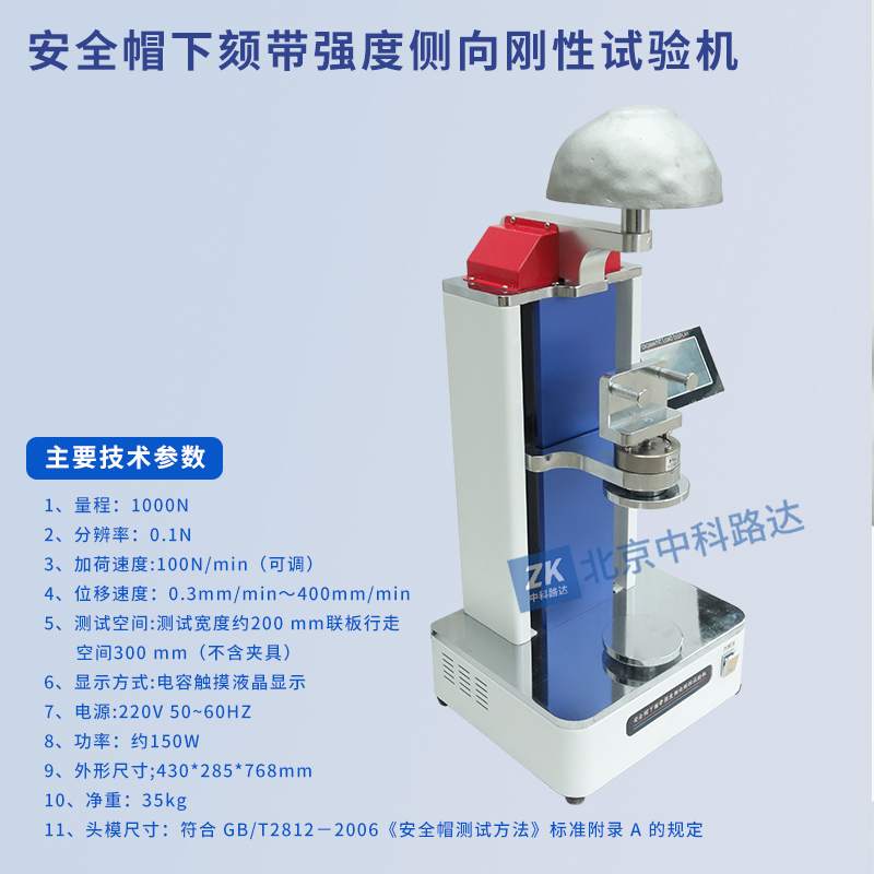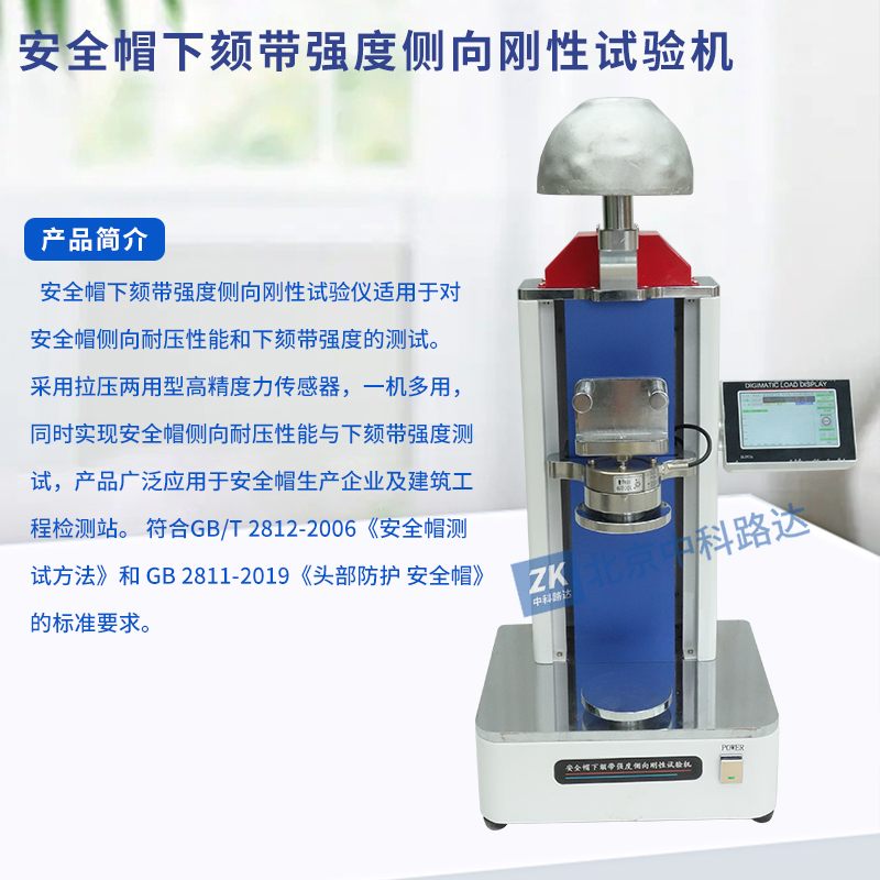 安全帽下頦帶強度側向剛性試驗儀適用于對安全帽側向耐壓性能和下頦帶強度的測試。采用拉壓兩用型高精度力傳感器,一機多用,同時實現安全帽側向耐壓性能與下頦帶強度測試,產品廣泛應用于安全帽生產企業及建筑工程檢測站。 符合GB/T 2812-2006《安全帽測試方法》和 GB 2811-2019《頭部防護 安全帽》的標準要求。