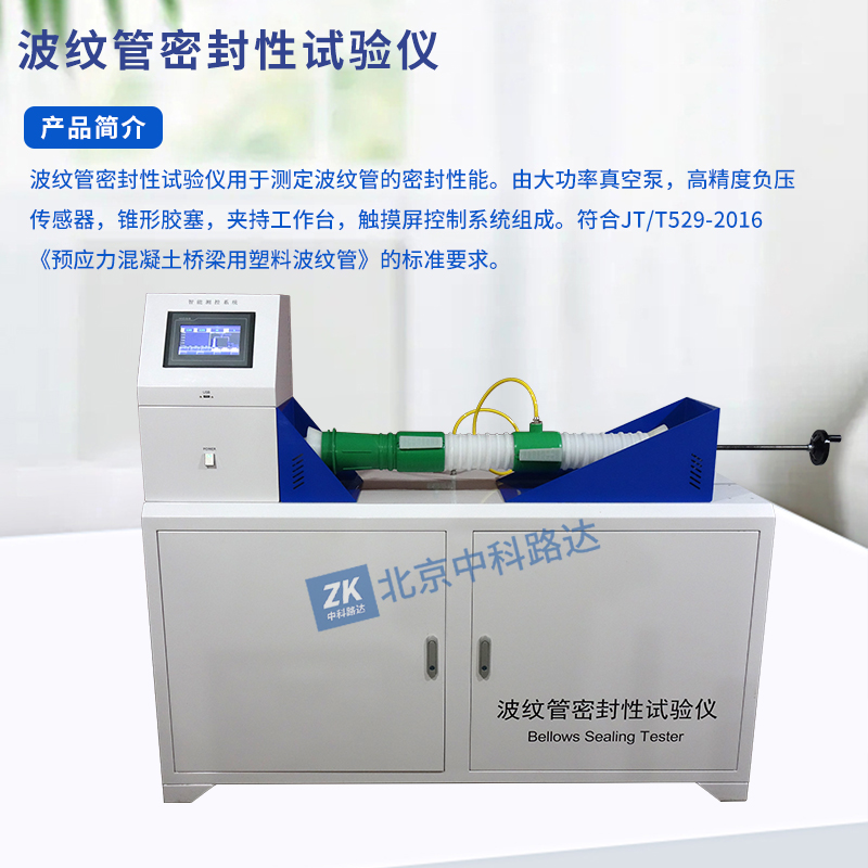 波紋管密封性試驗儀用于測定波紋管的密封性能。由大功率真空泵,高精度負壓傳感器,錐形膠塞,夾持工作臺,觸摸屏控制系統組成。符合JT/T529-2016《預應力混凝土橋梁用塑料波紋管》的標準要求。