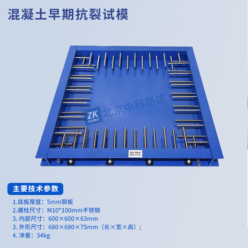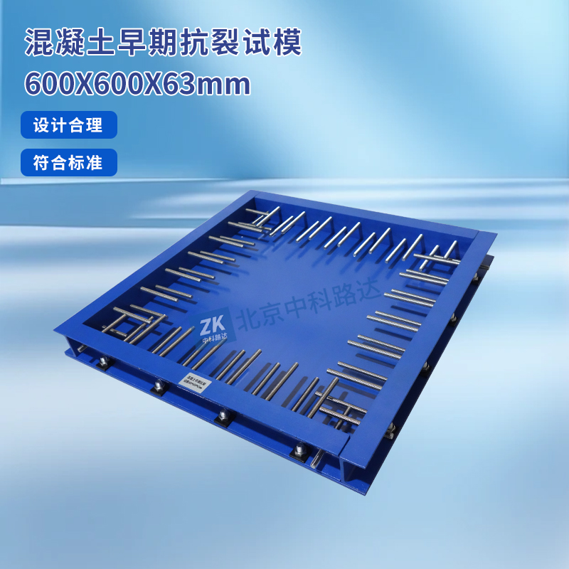 混凝土早期抗裂試模采用平板法測定水泥混凝土的早期開裂敏感性,測試水泥混凝土在約束條件下的早期抗裂性能。底座采用鋼板,四邊采用槽鋼,螺栓采用不銹鋼材質,尺寸標準,拆裝方便。符合JTG3420-2020《公路工程水泥及水泥混凝土試驗規程》中T0573-2020水泥混凝土早期開裂敏感性試驗方法(平板法)和CCES 01-2004《混凝土結構耐久性設計與施工指南》的標準要求。