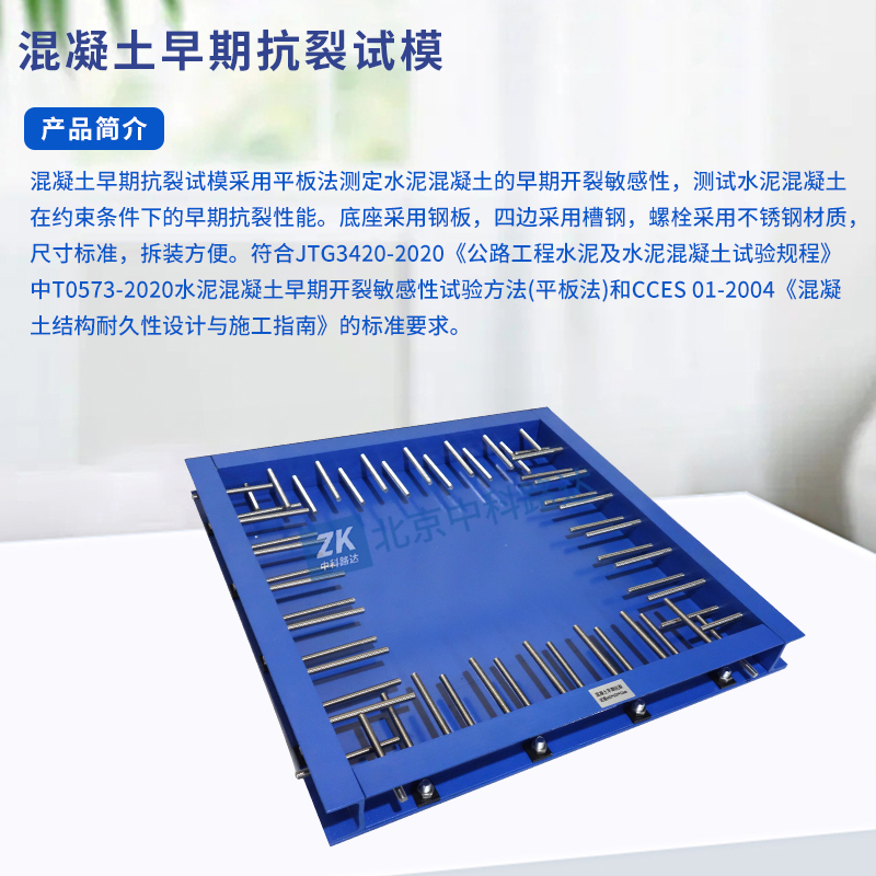 混凝土早期抗裂試模采用平板法測定水泥混凝土的早期開裂敏感性,測試水泥混凝土在約束條件下的早期抗裂性能。底座采用鋼板,四邊采用槽鋼,螺栓采用不銹鋼材質,尺寸標準,拆裝方便。符合JTG3420-2020《公路工程水泥及水泥混凝土試驗規程》中T0573-2020水泥混凝土早期開裂敏感性試驗方法(平板法)和CCES 01-2004《混凝土結構耐久性設計與施工指南》的標準要求。...