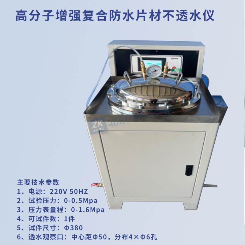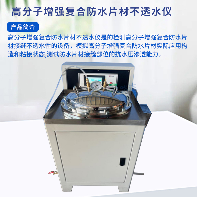 高分子增強復合防水片材不透水儀是的檢測高分子增強復合防水片材接縫不透水性的設備,模擬高分子增強復合防水片材實際應用構造和粘接狀態,測試防水片材接縫部位的抗水壓滲透能力。本產品采用電動水泵加壓,具有自動保持壓力、自動計時等功能。符合GB/T26518-2023《高分子增強復合防水片材》的標準要求。