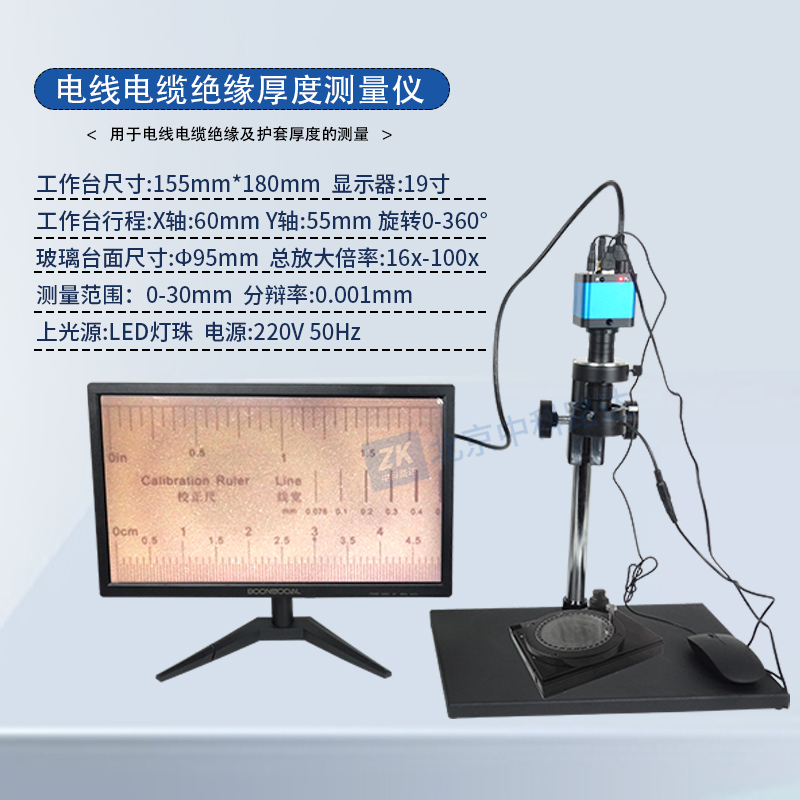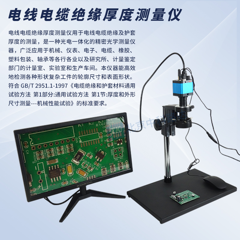 電線電纜絕緣厚度測量儀用于電線電纜絕緣及護套厚度的測量,是一種光電一體化的精密光學測量儀器,廣泛應用于機械、儀表、電子、電纜、橡膠、塑料包裝、軸承等各行各業以及研究所、計量鑒定部門的計量室、實驗室和生產車間。本儀器能高效地檢測各種形狀復雜工件的輪廓尺寸和表面形狀。符合 GB/T 2951.1-1997《電纜絕緣和護套材料通用試驗方法 第1部分:通用試驗方法 第1節:厚度和外形尺寸測量---機械性能試驗》的標準要求。
