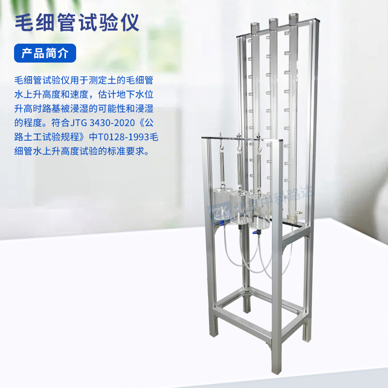 毛細管試驗儀用于測定土的毛細管水上升高度和速度,估計地下水位升高時路基被浸濕的可能性和浸濕的程度。符合JTG 3430-2020《公路土工試驗規程》中T0128-1993毛細管水上升高度試驗的標準要求。